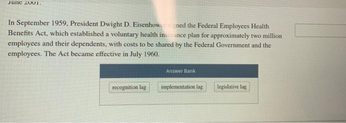 Label each of the following examples of fiscal policy lags.. Label each of the following scenarios in which there are problems enacting and applying fiscal policy as being an example of either a recognition time lag, action time lag, or effect time lag Policy lags arise because government actions are not instantaneous