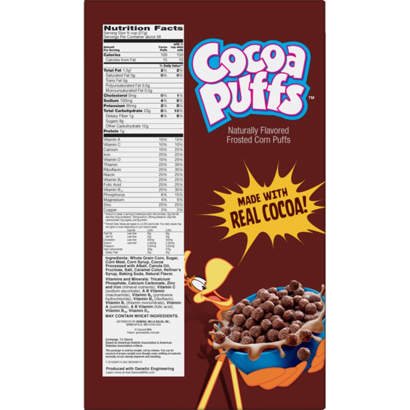 General Mills Cocoa Puffs Frosted - 10.4 Oz. Frosted corn puffs. Naturally flavored. Per 1 Cup Serving: 140 calories; 0 g sat fat; 130 mg sodium (6% DV); 12 g total sugars. See nutrition facts for as prepared information. Contains bioengineered food ingredients.
