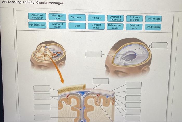 Correctly label the following meninges of the brain. Answer to correctly label the following lymphatics of the thoracic cavity. There are neurolemmocytes or oligodendrocytes at a node of ranvier. Some neurons are specialized to detect stimuli whereas neurons send signals to the effectors of the nervous system. As the lungs expand while. Correctly label the following functional regions of the cerebral cortex. O o help save exit submt a m correctly label the following structures in the sympathetic nervous system. Two long ganglionated nerve strands one on each side of the vertebral column extending from the base of the skull to the coccyx. Anatomy and Physiology questions and answers. Correctly label the following meninges of the brain. Arachnoid villus Arachnoid mater Subdural space Meningeal layer Pia mater Periosteal layer Dura mater: Subarachnoid space Falx cerebri Dura mater: Reset Zoom. Question: Correctly label the following meninges of the brain. Correctly label the following meninges of the brain. Damage to the ___ may affect near vision accommodation.. Consider a situation where a stroke or mechanical trauma has occurred resulting in damage to one of the areas of the brain indicated in the image. Drag each label into the proper location in order to identify the area that would most...