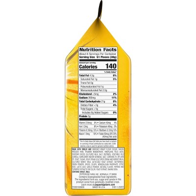 Representation of label(s). The actual nutritional label(s) on the package may vary slightly Nutrition Facts (Unprepared) Serving Size 1.5 oz Servings Per Container 72 Amount Per Serving Calories 200 Calories from fat 60 % Daily Value* Total Fat 7 g 11% Saturated Fat 2 g 10% Trans Fat 0 g Polyunsaturated Fat 2 g Monounsaturated Fat 3.5 g goldfish crackers, wg cheddar.75 oz (mfg label): made with smiles and whole wheat flour, unbleached enriched wheat flour (flour, niacin, reduced iron, thiamine mononitrate [vitamin b1], riboflavin [vitamin b2], folic acid), cheddar cheese (cultured milk, salt, enzymes, annatto), vegetable oils (canola, sunflower and/or The Goldfish crackers nutrition facts label tells us that the cheddar cheese is made from cultured milk, salt, and enzymes. Before feeding your pooch cheddar cheese, make sure they are tolerant of dairy food. Another factor to consider is that the yellow color of the Goldfish crackers comes from a vegetable dye called annatto. According to The. Calories in Goldfish Crackers based on the calories, fat, protein, carbs and other nutrition information submitted for Goldfish Crackers.