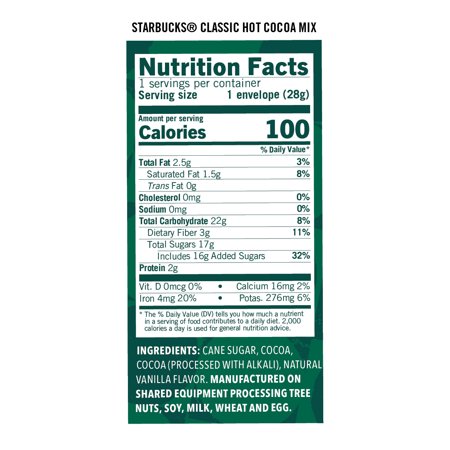 Starbucks beverage Milk soy Serving size 100 grams 1 ounce 28g Tall 12 fl oz 340g Grande 16 fl oz 453g Venti® 20 fl oz 566g FOOD SUMMARY Starbucks Beverage Nutrition Information s s ns CAFFE LATTE Short - Skimmed Milk 666 2788 01 01 00 36 756 99 00 89 64 750 Skim 2 soy almond or coconutmilk served chilled or over ice Simply refreshing Starbucks soy milk contains 150 calories and 14 grams of sugar in a tall latte Thats exactly the same amount of calories and sugar youd have in your latte with 2 milk Fortunately Starbucks coconut milk and almond milk both provide a lower calories and sugar option Which Starbucks Milk is Healthiest Starbucks Coffee Company Beverage Nutrition Information Clover® Brewed Coffee - Medium Roast Venti® NA NA 591 mL 10 0 0 0 0 10 0 0 0 1 0 0 0 0 445 Iced Coffee with Milk Tall Soy NA 354 mL 80 1 01 0 0 25 16 0 16 2 2 0 6 2 90 Pics of Starbucks Soy Milk Nutrition Label Is Starbucks Soy Milk Sweetened Quora Is The Soy Milk That Starbucks Uses Healthy It High In How To Order Healthier Less Expensive Starbucks Drinks How To Order Healthier Less Expensive Starbucks Drinks See also Grohe Europlus Kitchen Faucet Installation Check Starbucks Coffee menu with nutrition to see Starbucks Coffee calories carbs fat and protein You can also learn about ingredients and allergen information from the complete Starbucks Coffee nutrition chart GO White Hot Chocolate with Soy Milk and No Whip Grande cal 370 90 10 5 0 0 220 58 1 54 13 Nutrition Information Nutrition information is calculated based on our standard recipes Only changing drink size will update this information Other customizations will not Not available for this item Nutrition information is calculated based on our standard recipes Brown Sugar Milk Chocolate Chunks Sugar Cocoa Butter Whole Milk Powder Unsweetened Chocolate Soy Lecithin An to store prepare and serve them Customers with allergies can find ingredient information for products on the labels of our packaged products or online Starbucks Nutrition Facts Nutrition facts for the full Starbucks Coffee menu Select any item to view the complete nutritional information including calories carbs sodium and Weight Watchers points You can also use our calorie filter to find the Starbucks menu item that best fits your diet = Voted a healthy and tasty option Vanilla Soymilk Silk ® Soymilk is the Original Nutrition Powerhouse TM made from whole-harvested soybeans grown in the US and Canada Its soy rich and soy creamy with a note of vanilla buy online where to buy 43 There are 127 calories in 1 cup of Soy Milk Get full nutrition facts and other common serving sizes of Soy Milk including 1 oz and 1 fl oz See nutrition panel for information on sugar and calorie content 2 In a diet low in saturated fat and cholesterol 25 grams of soy protein per day may reduce the risk of heart disease A serving of Silk Organic Unsweet Vanilla Soymilk has 7 grams Soy milk is the second to least healthy milk at Starbucks containing a whopping 27 grams of sugar and 270 calories per serving Although this milk is sweet and has a touch of vanilla you pay the price with its costly ingredients 4 2 Milk Dietary Notes By ingredients Starbucks Non-Dairy Creamers are dairy-free non-dairy egg-free gluten-free peanut-free soy-free vegan and vegetarian For More Product Information Visit the Starbucks at Home website at athomestarbuckscom Always read the ingredient and nutrition statement prior to consumption 2 Soy Latte or anything else with Starbucks organic soy milk Logically it makes sense to choose organic soy milk since Starbucks decided to eliminate organic cows milk as an option a few years ago But not so fast Starbucks organic soy milk has one ingredient they would rather you not know about Starbucks caffe latte with coconut milks contain between 70 180 calories depending on your choice of sizes Calorie goal 1860 cal New Starbucks Secret Menu Drinks Are Refreshing And Sort Of Find nutrition facts for over 2000000 foods Starbucks coconut milk nutrition label Choose from the sizes below to see the full nutrition facts We cannot guarantee that any unpackaged products served in our stores are allergen-free because we use shared equipment to store prepare and serve them Customers with allergies can find ingredient information for products on the labels of our packaged products or by calling Starbucks Customer Contact Center at 800-STARBUC 800-782-7282 The short answer would seem to be yes From that list of ingredients they seem to have added Vitamin A D B12 Riboflavin B2 and Calcium Carbonate which is used to add Calcium Pretty much the same as the Silk brand equivalent Organic Soymil Milk of choice Request nonfat milk or non-dairy soymilk almondmilk or coconutmilk to adjust the calories or fat Swap your syrup Select sugar-free vanilla syrup for great flavor without added calories or sugar Ask for fewer pumps Ask for less syrup to help reduce the sweetness and calories in any beverage Scroll below to view the latest Starbucks menu prices and calories for their entire menu Starbucks drinks menu includes a wide variety of Coffee Espresso Frappuccino Tea Refreshers and many more In addition to their beverages Starbucks has added All Day Breakfast Lunch and Anytime Snacks to complement their drinks Where do the calories in Starbucks Soy Milk come from 224 507 269 Protein Total Carbohydrate Total Fat 203 cal The Daily Value DV tells you how much a … 31 Starbucks Coconut Milk Nutrition Label Written By Kim M Grant Thursday August 26 2021 Add Comment Edit Starbucks coconut milk nutrition label Starbucks Newly Offered Coconut Milk Confirms It S The Vitamin Tulang Hical Kalsium Vitamin D Calsium Tablet Kunyah 470 calories Add to Order Buttery caramel syrup blended with coffee milk and ice then topped with a layer of dark caramel sauce whipped cream caramel drizzle and a crunchy caramel-sugar topping—oh-so-beautifully delicious 1 to 10 of 10676 for Starbucks Vanilla Soy Milk Vanilla Soy Milk Starbucks Per 1 c