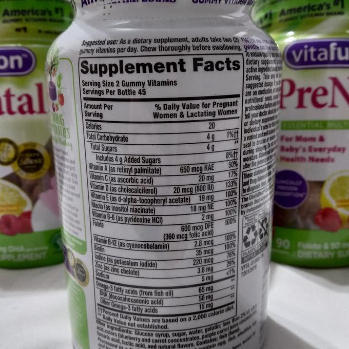Each serving of vitafusion™ PreNatal includes essential vitamins and minerals and 50 mg of Omega-3 DHA. It is also an excellent source of folic acid. vita fusion ™ PreNatal gummies are delicious, and with no iron, they are easy on the stomach.*. The high-quality, purified fish oil used in vita fusion ™ PreNatal has been tested for mercury.