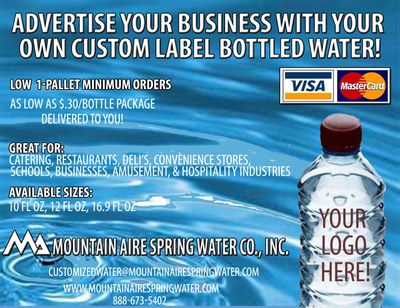 Binnewater Private Label Bottled Water Promote your Business or Special Event with Water! Bottled water is an excellent way to put your business in the public eye. You can literally put your brand right into the public's hands. In a sense they will be unable to avoid your name. Bottled water is also a great way to convey a message. Private label spring water. Springwater is the most natural form of water that comes directly from nature. A river or spring is the source of water. For instance, the Sierra Mountain is the source of Tahoe mountain spring water. People pick spring water due to its taste and containing minerals. Artesia Springs is the last stop in your search for custom bottled water. Just when you thought there were no more clever, creative and affordable ways to promote your business or Event, along comes Custom Labeled Bottled Water. Private label bottled water has seen an increase in market share of +0.9% with a total marked share of 12.5%. take their private label water bottle home, or to their next location. Clients indicate that customers regularly keep their premium private label water bottles creating more exposure for your brand. Jackson Springs Private Water Bottles are a cost effective advertising tool starting from only $2.50 per bottle.*.