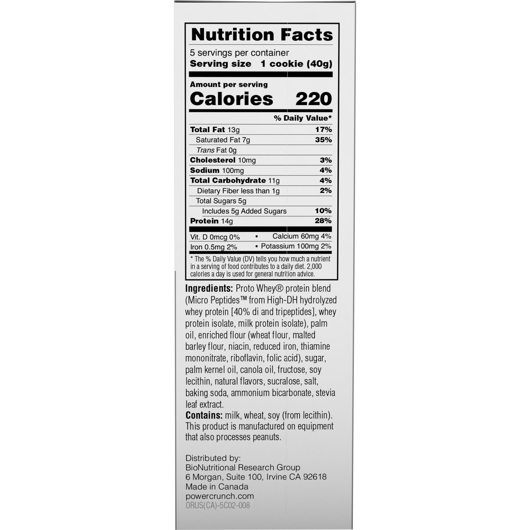 Courtesy of Power Crunch 215 calories, 13 g fat (7 g saturated fat, 0 g trans fat), 120 mg sodium, 12 g carbs (1 g fiber, 5 g sugar), 13 g protein This is less of a bar and more of a wafer-style cookie, and it shows! If you receive a product from Giant Food, and the nutritional information on the product label does not match the information on our site, please contact Giant Food customer service and we will arrange for a credit to issue for the product at issue.. Save when you order Power Crunch Protein Energy Bar Original Triple Chocolate - 12 ct and... Power Crunch is a high-protein bar made by BioNutritional Research Group. Unlike other nutrition bars, which are often chewy, the Power Crunch is a creme-filled wafer cookie that is not only high in protein, it is also low in carbohydrates. Knowing the nutrition information for this bar can help you determine how it fits into your meal plan. Nutrition Serving Size: 1 cookie (58g) Amount per Serving My Daily Value Calories 310 Kcal 18% Total Fat 22 g 35% Saturated Fat 11 g 65% Trans Fat 0 g 0% Cholesterol 20 mg 7% Sodium 200 mg 9% Potassium 220 mg 5% Total Carbohydrate 14 g 6% Dietary Fiber 2 g 8% Sugars 4 g 6% Added Sugars 4 g 17% Protein 20 g 42% Calcium 90 mg 9% Iron 2 mg 11%