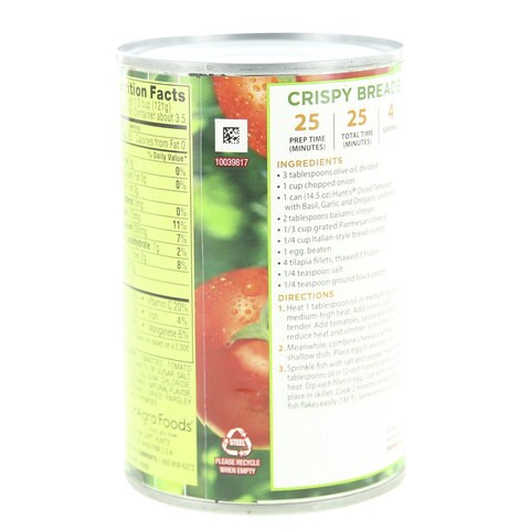 <label>20% off</label> your first subscription order 20% off your first subscription order.. Hunt's, 100% Natural, Diced Tomatoes with Basil, Garlic & Oregano, NO SALT ADDED, 14.5oz Can (Pack of 6)... Fat Calories Per Serving. 0 Calories <40 Calories; Nutrition Facts Per Serving. Fat Free (<0.5g) 1/2 cup servings per container: Hunts Diced Tomato Nutrition Label. Diced tomatoes (tomato roma fresh 25 lb), olive oil (olive pomace oil), fresh parsley. The amount of fruits, vegetables and nuts is not specified on the label, it was estimated from the category (vegetables based foods) of the product. Diced tomatoes (tomato roma fresh 25 lb.