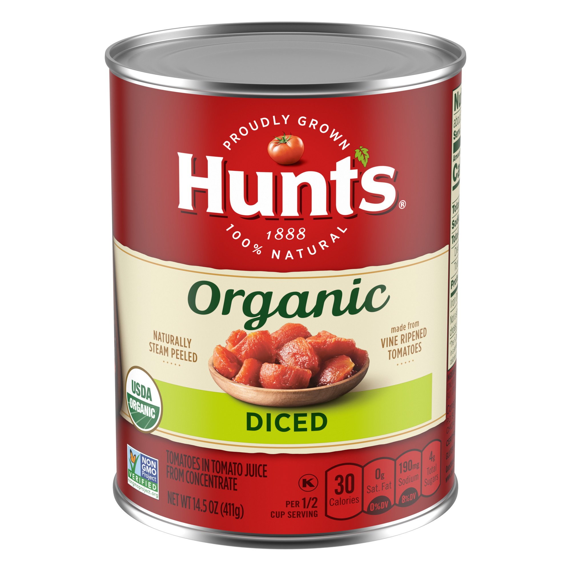 Diced Tomatoes. No rating value average rating value is 0.0 of 5. Read 0 Reviews Same page link. Write a review. Hunt's Diced Tomatoes are cut from firm, peeled tomatoes and packed in their own juice. Available Sizes: 14.5 oz, 28 oz. See ingredients, nutrition, and other product information here. Smartlabel Info. Sold Out$2.79. Hunt's Diced Tomatoes are free of artificial ingredients and preservatives, harvested and packed within hours, these vine-ripened tomatoes always taste fresh. With only 15mg of Sodium per Serving these tomatoes are a perfect substitute in your diet. 100% natural and 100% quality. Nutrition Facts: Serving size: 1/2 cup. Hunt's vine-ripened tomatoes are peeled, diced, and ready to go. No compromise, Hunt's Diced Tomatoes are 100% natural, with no artificial preservatives. Hunt's Flashsteam® tomatoes are peeled with simple hot water. Contains 14.5 oz of diced tomatoes; 30 calories per serving. Hunt's tomatoes are picked at the peak of ripeness and canned within. This lower-sodium alternative to Hunt's Petite Diced Tomatoes is perfect for any dish that needs smaller pieces of tomatoes, such as quesadillas, pizza, bruschetta, green or pasta salads, wraps, and burritos. See ingredients, nutrition, and other product information here. Smartlabel Info. Buy Now. Tell your friends: You May Also Like. Roasted.