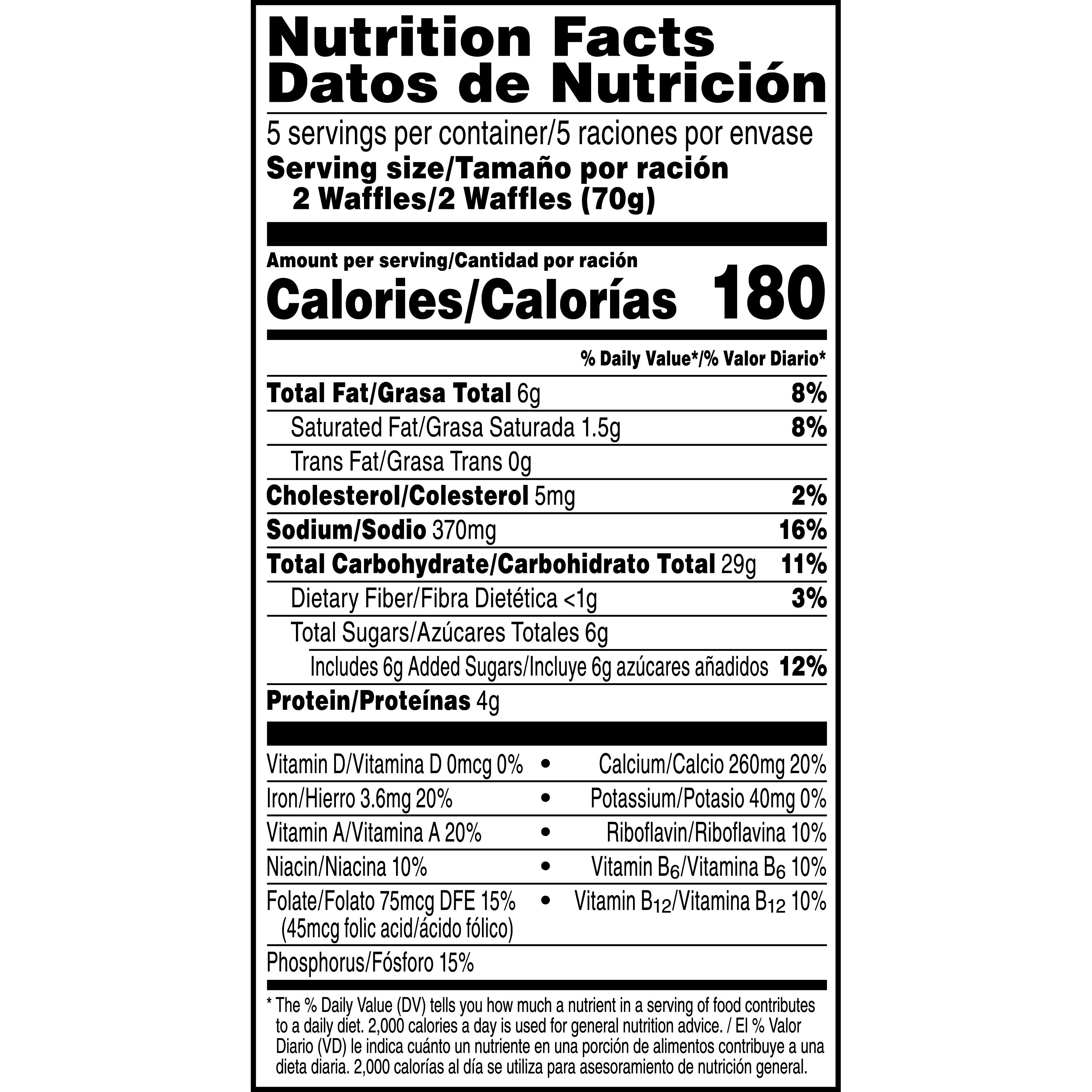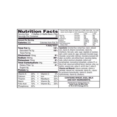 Nutritional Facts and calories about KELLOGG'S, EGGO Protein, Waffles, Homestyle. Review the charts, find similar foods, and use the icons to find food for a healthy lifestyle. Ingredients. Enriched flour (wheat flour, niacin, reduced iron, vitamin B1 [thiamin mononitrate], vitamin B2 [riboflavin], folic acid), water, vegetable oil (soybean and palm, canola and/or cottonseed), sugar, eggs, leavening (baking soda, sodium aluminum phosphate, monocalcium phosphate), contains 2% or less of salt, dextrose, spice, whey, soy lecithin.Vitamins and Minerals: Calcium carbonate. Eggo* Thick & Fluffy Belgian Waffles Original. 330 GRM. 00064100107649. Nutrition. Ingredients . Allergens . Features & Benefits . Company, Brand & Sustainability . 160. Calories. 2 g. Saturated Fat. 250 mg. Sodium. 3 g. Sugar. Nutrition Facts. Per 1 waffle (55 g) Amount Per Serving; Calories 160 : Amount/Serving % Daily Value* Total Fat 8 g. Oct 19, 2015 · Official Nutrition Label Information Eggo Bites Mini Waffles Maple Flavored Kellogg Company - Proprietary Flavor Descriptor Carbohydrates Fat Protein Free NLI Description 2 1 Brand Serving Size Serving Size g Serving Size oz Calories Calories from Fat Total Fat 5 g 8 % g % Saturated Fat 1.5 g 8 % g % Trans Fat 0 g g Polyunsaturated Fat g g