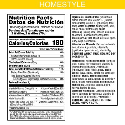 America's classic Eggo® waffle. Eggo® Homestyle Waffles are the taste of homemade without all of the work. Enjoy the crispy, convenient family favorite. Nutrition Facts and Ingredients. Select pack size: 74.1oz 49.3oz 29.6oz 12.3oz 74.1oz. 74.1oz. 74.1oz. 49.3oz. 29.6oz.