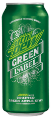 Mtn Dew Green Label with green apple kiwi flavor. A curiously daring Dew. Made with real sugar and real juice. Only 160 calories per can. 16 oz can. Mountain Dew Green Label soda is a curiously daring Dew crafted with green apple kiwi flavors.