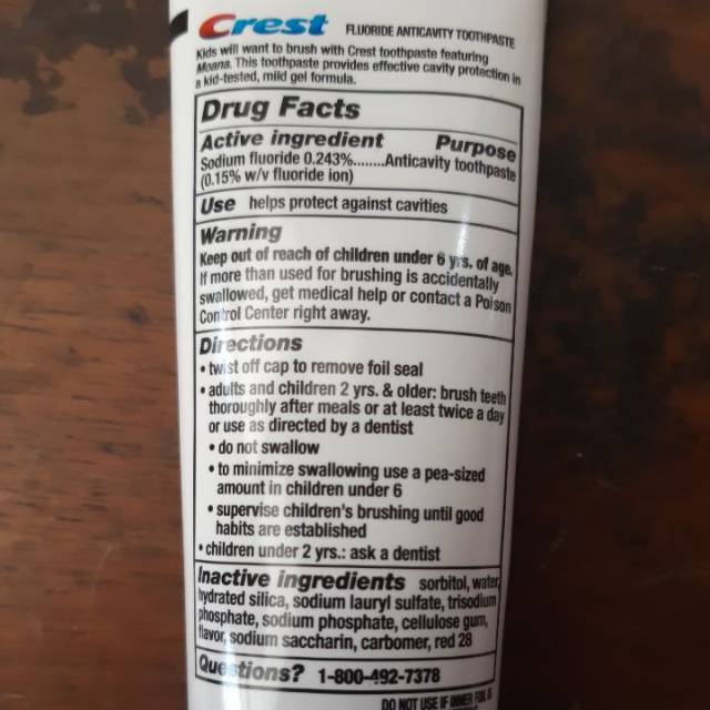 The overconsumption of toothpaste has negative consequences, particularly for children. This study's objectives were to describe misleading marketing strategies used in selling children's fluoridated toothpaste and identify warning label characteristics. Two researchers independently coded the packa. WARNING LABELS ON TOOTHPASTE WARNING: Keep out of the reach of children under 6 years of age. If you accidentally swallow more than used for bushing, seek professional assistance or contact a Poison Control Center immediately. As with other toothpaste, if irritation occurs discontinue use. DIRECTIONS: Adults and children 2 years and older.
