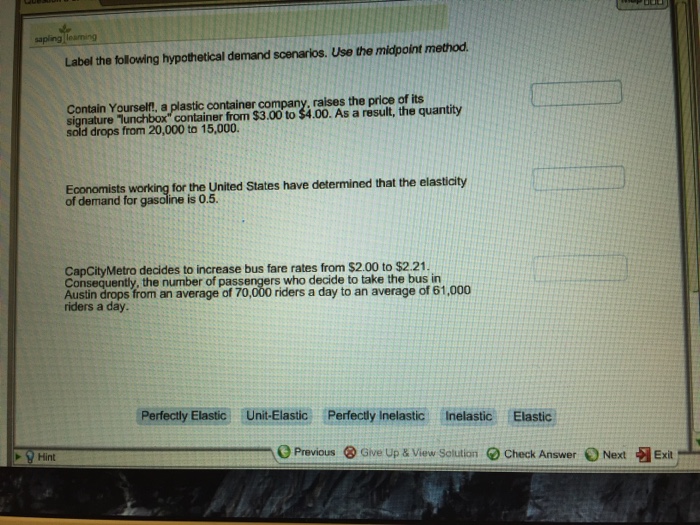 a Sapling Learning n'at l'l l in on n "it; Label the following hypothetical demand scenarios. Use the midpoint method. Contain Yourself!