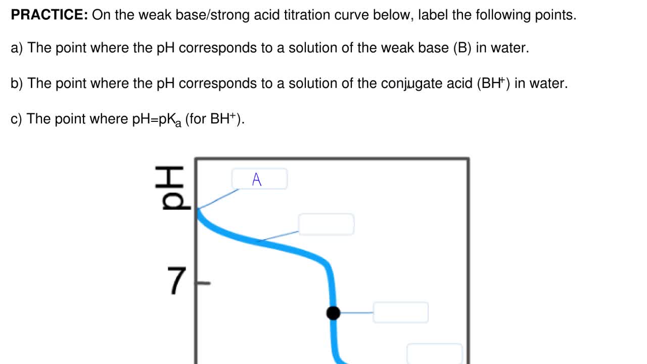 On the weak base/strong acid titration curve below, label the following points. a) The point where the pH corresponds to a solution of the weak base (B) in water. b) The point where the pH corresponds to a solution of the conjugate acid (BH +) in water. c) The point where pH=pK a (for BH + ).