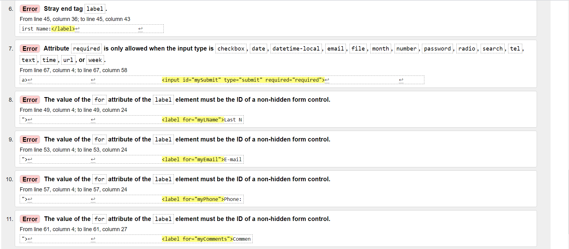 24.11.2019 · Your issue is happening in the label/inputs you have where your label's have for attributes but your inputs don't have id attributes. You can fix this as follows: <label for="myFirstName"> First Name:</label> <input type="text" id="myFirstName" name="myFirstName" required="required"> <label for="myLastName"> Last Name:</label> …