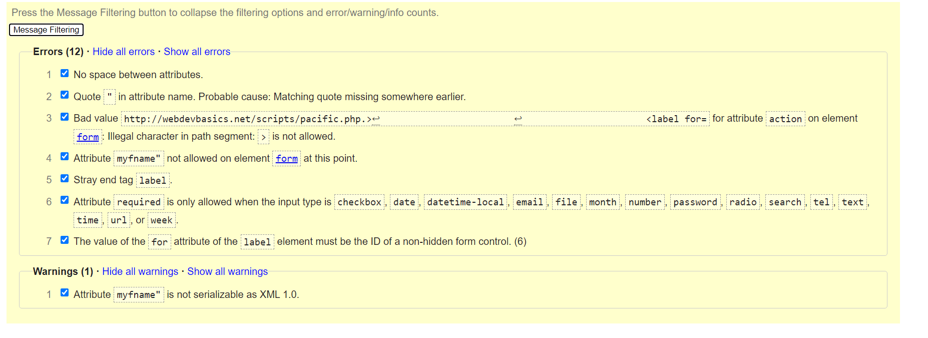 Question: Path of Light Yoga Studio Chapter 9 Question: I have finished my assignment but I continue to get the error: "The value of the for attribute of the label element must be the ID of a non-hidden form control." when I try to validate it.