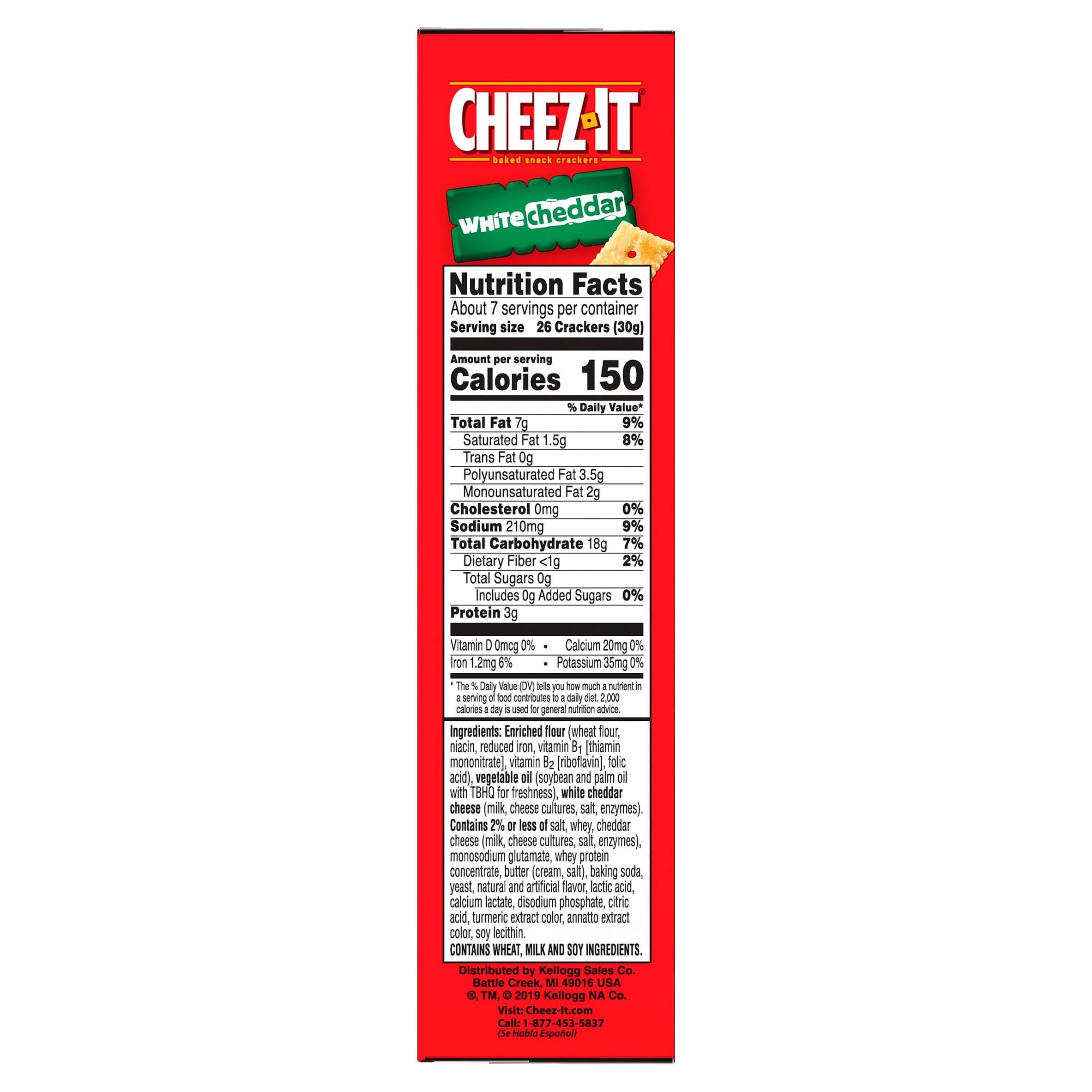 Nutrition label for cheez its. Cheez-It is a brand of cheese cracker manufactured by the Kellogg Company through its Sunshine Biscuits division. Approximately 26 by 24 millimetres (1.0 by 0.94 in), the rectangular crackers are made with wheat flour, vegetable oil, cheese made with skim milk, salt, and spices. Calories, carbs, fat, protein, fiber, cholesterol, and more for Cheez-It Baked Snack Crackers ( Cheese - Cheez-It). Want to use it in a meal plan? Head to the diet generator and enter the number of calories you want. grams crackers oz. Nutrition Facts. For a Serving Size of 29 crackers ( 30 g) How many calories are in Cheez It Reduced Fat Crackers? Amount of calories in Cheez It Reduced Fat Crackers: Calories 130. Calories from Fat 36 ( 27.7 %) % Daily Value *. How much fat is in Cheez It Reduced Fat Crackers? The % Daily Value (DV) tells you how much a nutrient in a serving of food contributes to a daily diet. 2,000 calories a day is used for general nutrition advice. 16.5 Net Carbs Per Serving Add to Food Diary