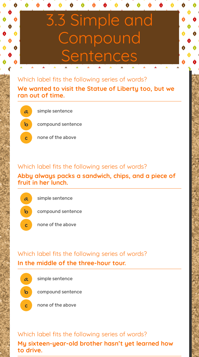 Simple Sentences with "label"; A simple sentence with "label" contains a subject and a verb, and it may also have an object and modifiers. However, it contains only one independent clause. Compound Sentences with "label"; A compound sentence with "label" contains at least two independent clauses. These two independent clauses can ...