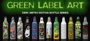 Green Label Art was a promotion that involves a collection of Mountain Dew bottles designed by the creative minds from the world of contemporary art and culture. Six designers of each series of a volume were invited to use a 16oz aluminum bottle as their canvas to create their own expression of Mountain Dew. Together they've created the special ...