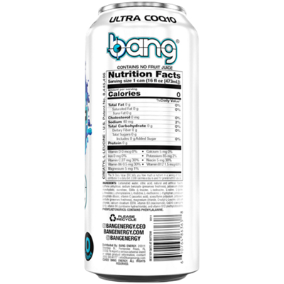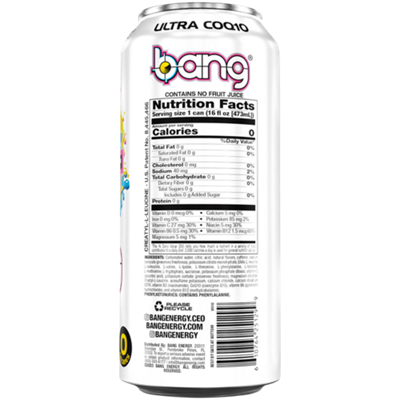 Bang Energy's Nectarine Blueberry shots will have you keeping up the Christmas spirt with a whopping 300mg of caffeine, EAAS and Super Creatine. 🎉 . 🎁Bang Energy's Nectarine Blueberry shot and RTD is only available at @vitaminshoppe! . Tag a friend who has yet to try this new flavor! . BANG Super Creatine Energy Drink Cotton Candy 16 oz can Nutrition 0 Calories 0g Sat Fat 40mg Sodium 0g Sugars Nutrition Facts Serving Size 16.0 fl oz (1.0 can) Amount Per Serving Calories 0 Calories from Fat 0 % Daily Value* Bang Energy is an amazing drink that doesn't lie about its explosive boost claims. However, it's just natural for you to be doubtful from time to time. This can also be because energy drinks are sometimes mentioned on the news causing harmful effects.. Bang Energy is a good and established brand. But there are rumors that Bang Energy can also lead to heart problems, insomnia, and dizziness ...