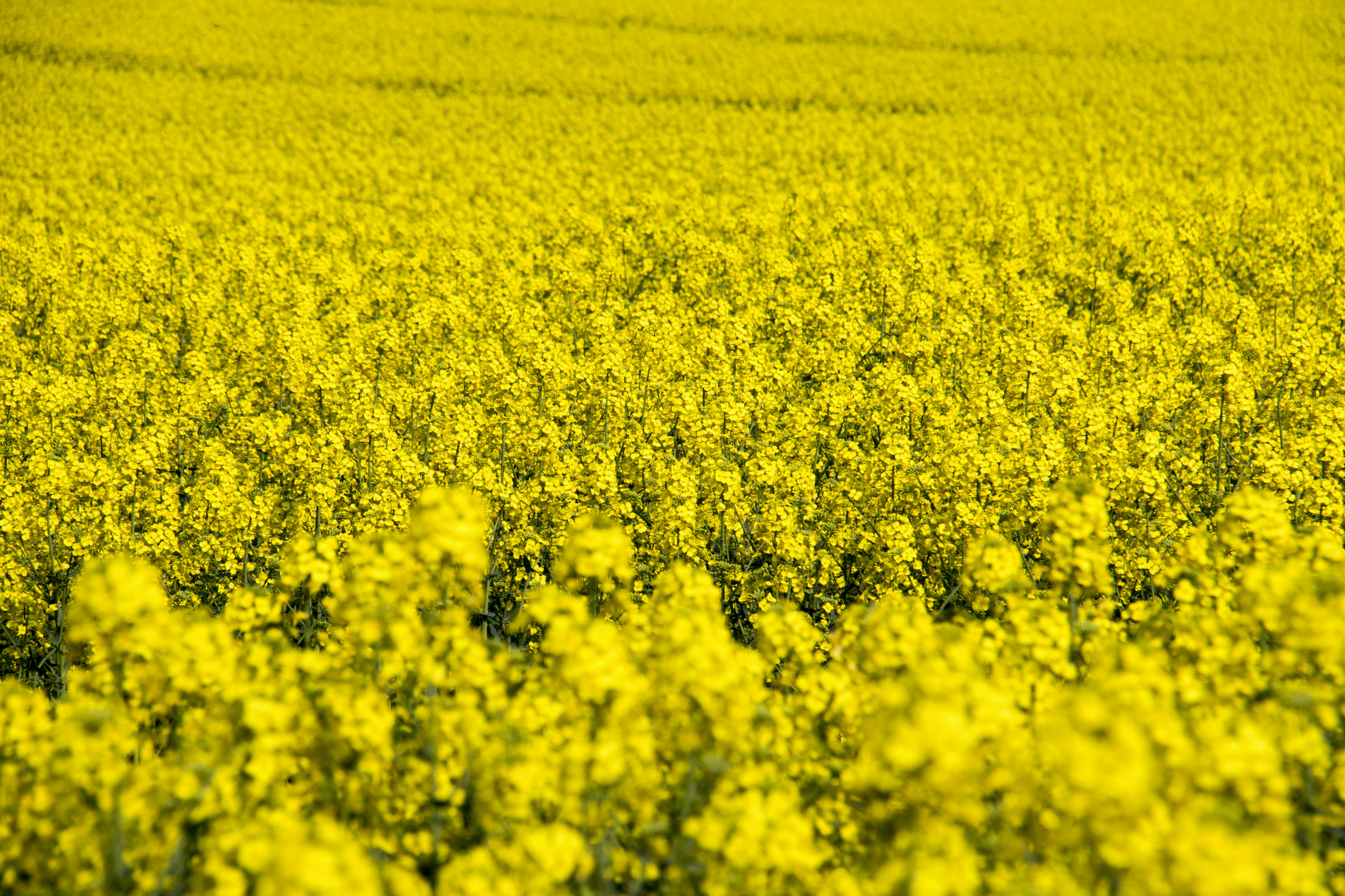Sustainable a field of Rapeseed in the English Countryside at Gussage All Saints. With just a handful of Poppies. A colourful and organic field.