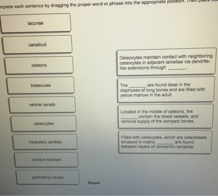 Complete each sentence by dragging the proper label into the appropriate position.. Complete each sentence by dragging the proper word or phrase into the appropriate position. Then place eech sentence in the correct order beginning with the one furthest from the medullary cavity. 1. Mineralization of the cartilaginous walls between lacunae provides a temporary framework in the zone of calcification _____ in which the final ... Complete each sentence by dragging the proper label into the appropriate position. Then, rearrange the sentences in order from proximal to distal through the digestive tract. Drag the text blocks below into their correct order. pyloric The junction of the small and large intestines is marked by a pronounced muscular swelling known as the leal ... Complete each sentence by dragging the proper label into the appropriate position, then rearrange the sentences into a sequence identifying a continuum of decreasing pressures beginning with the vessel that encounters the greatest pressure. 1. The aorta is the first vessel blood enters upon exiting the heart. 2. Complete each sentence by dragging the proper word or phrase into the appropriate position. Bones that join together and are held in place with threads of collagen, form a(n) _____ joint.