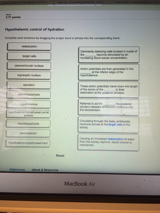 1. Complete each sentence by dragging the proper label into the appropriate position. a. A BUFFER is any mechanism that resists changes in pH. b. A PHYSIOLOGICAL BUFFER uses direct elimination of acids, bases, or carbon dioxide from the body in order to adjust systemic acidity. c. A substance that binds H+ during times of acidity and releases H+ during time of alkalinity is referred to as a ... Complete each sentence by dragging the proper label into the appropriate position. The ___ is the first vessel blood enters upon exiting the heart. The ___ expand and recoil with every heart beat due to a histologically dominant network of elastic tissue in the tunica media. Just prior to entering capillary beds, ____ have become extremely thin and Complete each sentence by dragging the proper label into the appropriate position. Plasma sodium concentrations above 145 mEq/L represent a condition that rarely occurs due to equal increases in water. The consumption of massive amount of water in a short time frame can produce resulting from a dilution of sodium in the ECF. Complete each sentence by dragging the proper word or phrase into the appropriate position to describe the accessory structures of a synovial joint. See image Correctly identify the factor(s) that limit a joint's range of motion.