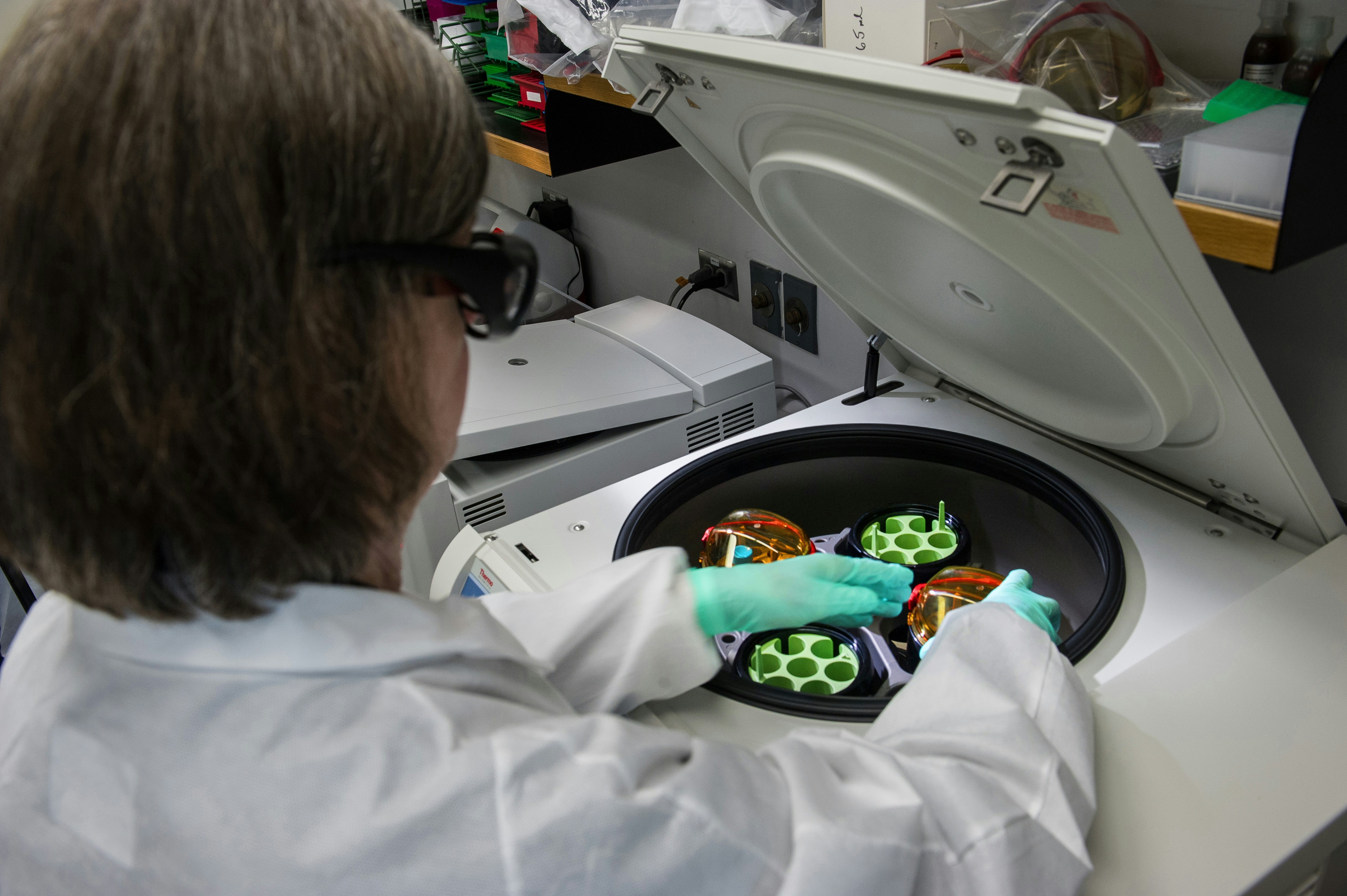 This Centers for Disease Control and Prevention (CDC) scientist was shown working with stool samples, which had been mixed with chemicals, and was placing the chemical mixtures into a centrifuge, which when spun up to a high rate of speed, would separate the solid material from the liquid supernatant.