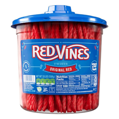 작업 이음식기록Candies / OtherCandies 영양소 정보, 다이어트 정보 및 칼로리 섭취량 Cherry Sugar Free Vines 6oz (Licorice) 브랜드Red Vines 영양 성분 1회 제공량 1 serving 1회 제공량당 함량 칼로리 90 지방 칼로리 0 % 일일 영양소 기준치 * 총 지방 0g 0% 포화 지방 0g 0% 트랜스 지방 0g 콜레스테롤 0mg 0% 나트륨 15mg 1% 칼륨 0mg 0% 총 탄수화물 25g 8% 식이... 작업 이음식기록영양소 정보, 다이어트 정보 및 칼로리 섭취량 Mixed Berry Twists 브랜드Red Vines 영양 성분 1회 제공량 3 twists 1회 제공량당 함량 칼로리 100 지방 칼로리 0 % 일일 영양소 기준치 * 총 지방 0g 0% 포화 지방 0g 0% 트랜스 지방 0g 콜레스테롤 0mg 0% 나트륨 10mg 0% 칼륨 0mg 0% 총 탄수화물 21g 7% 식이 섬유 0g 0% 당류 18g 단백질 1g 2% 비타민... 작업 이음식기록영양소 정보, 다이어트 정보 및 칼로리 섭취량 Candy, Licorice, Original Red Twists 브랜드Red Vines 영양 성분 1회 제공량 2 twists 1회 제공량당 함량 칼로리 140 지방 칼로리 0 % 일일 영양소 기준치 * 총 지방 0g 0% 포화 지방 0g 0% 트랜스 지방 0g 콜레스테롤 0mg 0% 나트륨 20mg 1% 칼륨 0mg 0% 총 탄수화물 34g 11% 식이 섬유 0g 0% 당류 16g... The iconic 3.5-pound Red Vines tub comes with a resealable lid to keep your red licorice candy fresh. This Red Vines bulk jar is perfect for sharing your favorite Original Red twists at the office, a BBQ, a party or at home. Add a sweet celebration to your day with the classic soft & chewy Red Vines red licorice people have loved for generations.