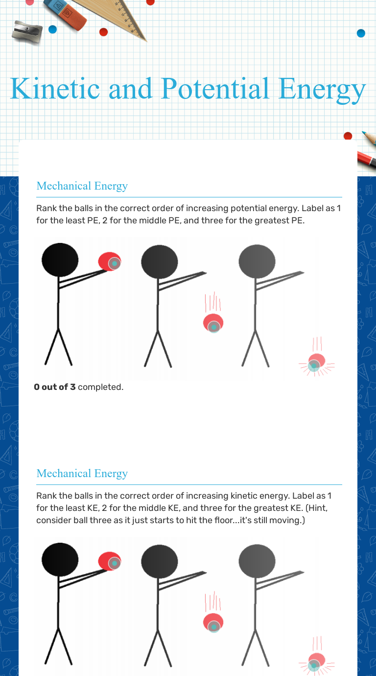PDF real world. Potential and Kinetic Energy in the Kinetic Energy The energy an object has because of its motion. The amount of kinetic energy an object has is influenced by its mass and speed. Examples of Kinetic Energy A roller coaster that is full of people has a greater ... Label the areas where potential and kinetic