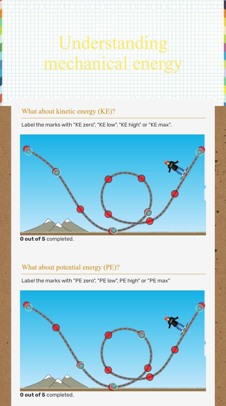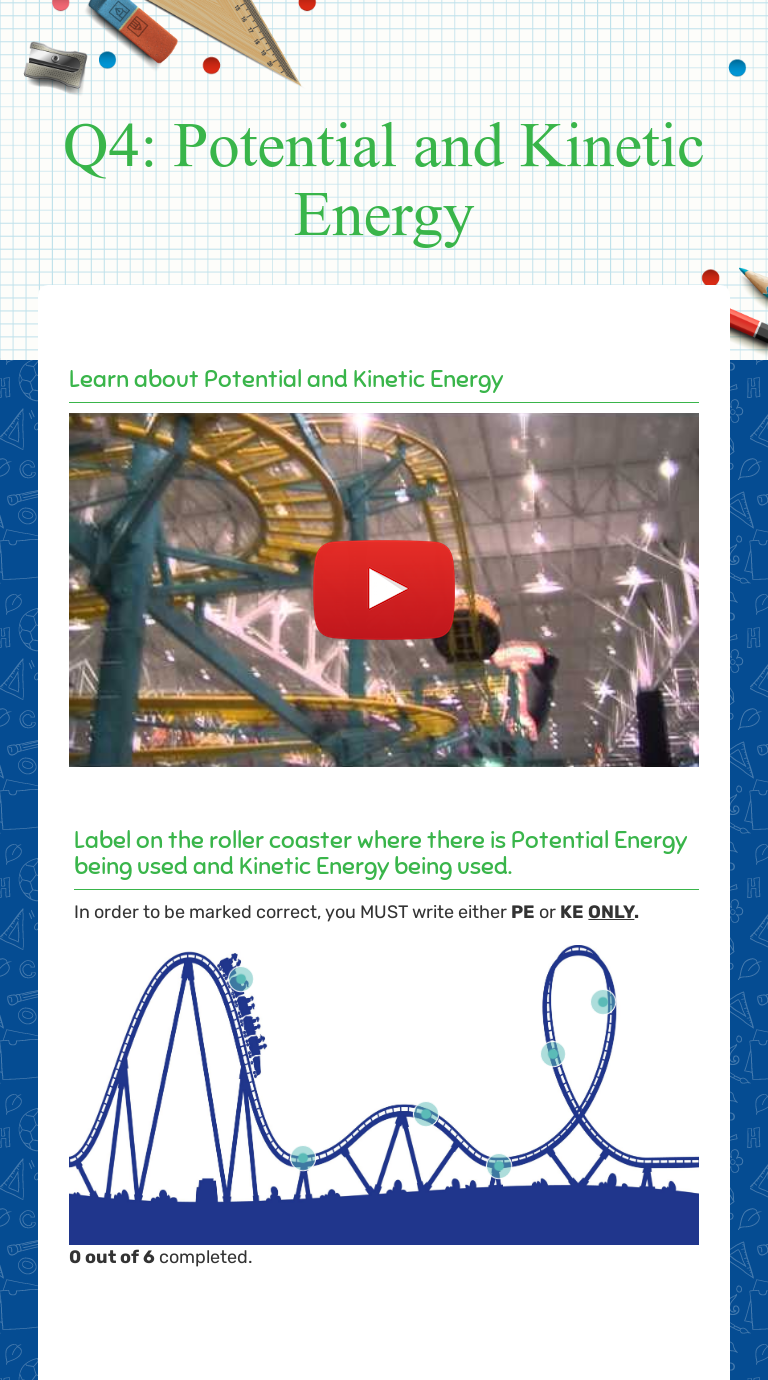 PDF CHAPTER 5 Thermal Energy As they move faster, their kinetic energy increases. Th ermal energy is the sum of the kinetic and potential energy of all the particles in an object. The figure shows that if either potential or kinetic energy increases, thermal energy increases. Kinetic energy increases. Potential energy increases. Speed increases. Separation increases. The ... Solved Label the diagram below with the correct values for ... Label the diagram below with the correct values for kinetic energy (KE) and potential energy (PE) along the path of the roller coaster. Assume that the roller coaster starts from rest. Who are the experts? Experts are tested by Chegg as specialists in their subject area. We review their content and use your feedback to keep the quality high. Energy Vocabulary Word List - Enchanted Learning A vocabulary list (word bank) of words about energy! EnchantedLearning.com is a user-supported site. Site members have full access to an ad-free, print-friendly version of the site. Paper Roller Coasters: Kinetic and Potential Energy ... Kinetic energy is the amount of energy an object has due to its mass and its speed. When a roller coaster car reaches the top of its very first hill, it is very high off the ground but moving very slowly. That means it has a lot of potential energy but very little kinetic energy. When it goes over the top and starts going down the hill, its ...