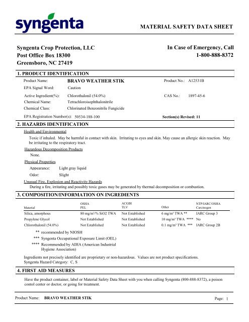 Bravo weather stik fungicide label. PDF Page 1 of 7 / V6 - Pest Genie BRAVO WEATHER STIK Fungicide November 2016 Conditions for Safe Storage, Including any Incompatibilities: Store in the closed, original container in a cool, well ventilated area. DO NOT store for prolonged periods in direct sunlight. Section 8: Exposure controls and personal protection ALWAYS READ AND FOLLOW THE LABEL INSTRUCTIONS AND WARNINGS Bravo Weather Stik® | ADAMA Bravo Weather Stik® Bravo Weather Stik is a broad-spectrum foliar fungicide labeled for use on multiple crops. Crop protection Broad-spectrum, non-systemic fungicide for multi-crop use. Sticks and stays in rainy weather conditions for long-lasting residual control. Multi-site Mode of Action reduces the likelihood of fungi developing resistance. Bravo Weather Stik® Fungicide - Reichman Sales & Service Bravo Weather Stik® Fungicide. Category: Fungicide; Manufacturer: Syngenta Crop Protection, Inc. EPA Number: 50534-188-100; Pack Size: Quantity: MSDS Label; Product Description: Disclaimer: Purchaser is responsible to read the Product Label and Use requirements for this product. Reichman Sales & Service assumes no liability for the use or ... PDF MATERIAL SAFETY DATA SHEET Syngenta Crop ... - Amazon S3 Have the product container, label or Material Safety Data Sheet with you when calling Syngenta (800-888-8372), a poison contol center or doctor, or going for treatment. Product Name: BRAVO WEATHER STIK EPA Registration Number(s): 50534-188-100 Ingredients not precisely identified are proprietary or non-hazardous. Values are not product ...