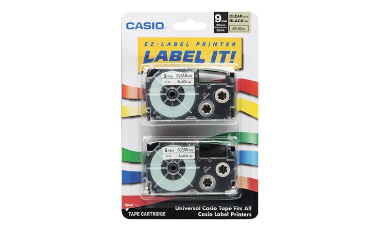 Casio 9mm Labelling Tape, Black on Clear, Double Pack (XR-9X2S). Clear Labels with Black Print Makes Text Easy to Read.