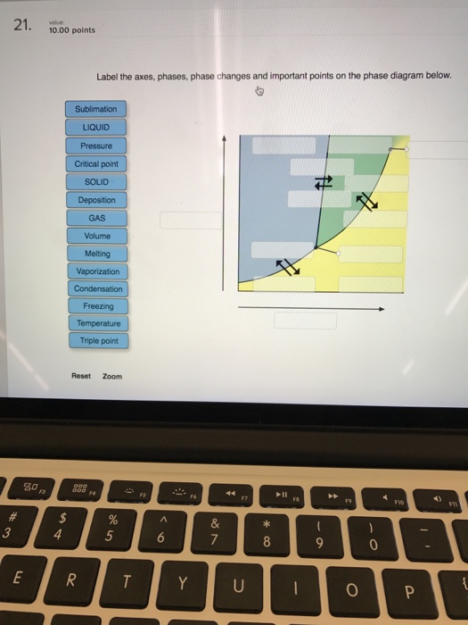 Solved Label the axes, phases, phase changes and important ... Label the axes, phases, phase changes and important points on the phase diagram below Vaporization SOLID GAS Triple point LIQUID Condensation Critical point Freezing Melting Volume Sublimation Temperature Deposition Pressure Reset Zoom References.
