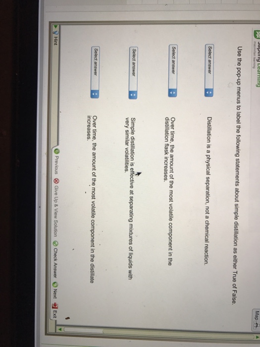 Solved Use the pop-up menus to label the following - Chegg Use the pop-up menus to label the following statements about simple distillation as either True of False. Select answer Distillation is a physical separation, not a chemical reaction. Sec rnover he mount o the most volatie component in the Over time, the amount of the most volatile component in the distillation flask increases.