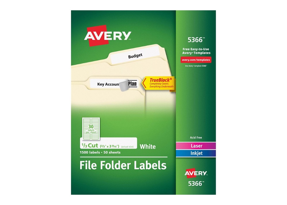 File Folder Labels | Labels Templates | Find a ... - Avery 20267. LEARN MORE. Avery ® Filing Labels Template. with TrueBlock™ Technology for Laser and Inkjet Printers, 3-7/16" x ⅔". 5366. LEARN MORE. Avery ® Extra Large Filing Labels Template. with TrueBlock™ Technology for Laser and Inkjet Printers, 3-7/16" x 15/16". 35027.