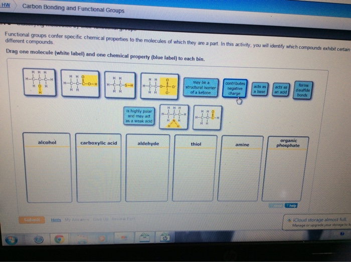 Hint 2 Chemical structures of functional groups The table ... Drag one molecule (white label) and one chemical property (blue label) to each bin. Hint 1. Organic compounds and their functional groups The table below shows the formulas of six biologically important functional groups and the compounds in which they are found.