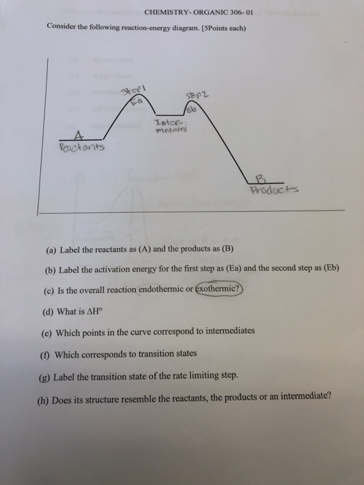 Label the reactants products and intermediates. PDF CHM 221: Organic Chemistry II - North Central College bromopentane. Label the positions for all reactants, intermediates and products. State which alkyl bromide would be the major product and why. [Notice! which curve has the higher energy carbocation intermediate and higher energy first transition state. Since these two possible reactions would be competing with each ENERGY TRANSFORMATIONS Flashcards - Quizlet Transition-state intermediates have higher energies than the reactants and/or products because a) the transition state is further along the time course of the reaction. b) energy has been used to supply the enzyme to the reaction. c) the chemical bonds of the reactants have been stretched and stressed to near breaking. [SOLVED] 6. Based on the mechanism proposed ... - CoursePivot Based on the mechanism proposed in the 'Data Sheets' section of your lab manual, sketch the reaction profile. Properly label the profile and include the identification of mechanistic steps, location of the activation energies (values not required), Lewis structures of the reactants, intermediates and products in the appropriate locations. (6 marks) organic chemistry - Can the reaction intermediate be lower ... I am confused because the solutions manual to one of the problems gives me an energy diagram with an intermediate that is of lower energy than both the reactants (but not the products), and labels the overall activation energy as the energy change between the intermediate state and the highest-energy transition state.
