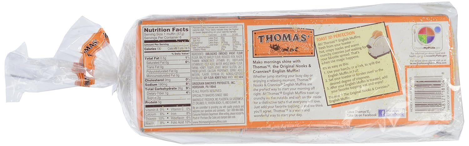 Calories in Thomas' Original English Muffins and Nutrition ... There are 150 calories in 1 muffin (61 g) of Thomas' Original English Muffins. Get full nutrition facts for other Thomas' products and all your other favorite brands. Save on Thomas' English Muffins Whole Grain 100% Whole ... Per 1 Muffin Serving: 120 calories; 0.5 g sat fat (3% DV); 230 mg sodium (10% DV); less than 1 g total sugars. 25 grams of whole grain. 0 g trans fat and low fat. Whole Grain. 25 g or more per serving. Eat 48 g or more of whole grains daily. WholeGrainsCouncil.org. Good source of fiber. Contains 6 muffins. PDF Tuesday Talks: Creditable and Non-creditable Foods Part 2 ... 6. Thomas '"whole wheat" English muffins, third grain ingredient is farina. Is this whole grain rich? Unfortunately, Thomas Whole Wheat English muffins are not whole grain rich. They do not meet the Rule of Three because farina is the third grain ingredient and is a non-creditable grain. The program may Thomas', English Muffin, Original Nutrition Facts & Calories Rich in vitamins and minerals (7%/cal) - a good source of Calcium and Iron. Contains a moderate amount of risky components that may include sodium and sugars (0.01%/oz). Good source of proteins (14% of DV/100g). Calories in 1 Muffin (2 oz) 120 calories / 9 from fat Carbohydrates 25 g Proteins 4 g Fat 1 g Saturated Fat 0 g Calories Nutrition