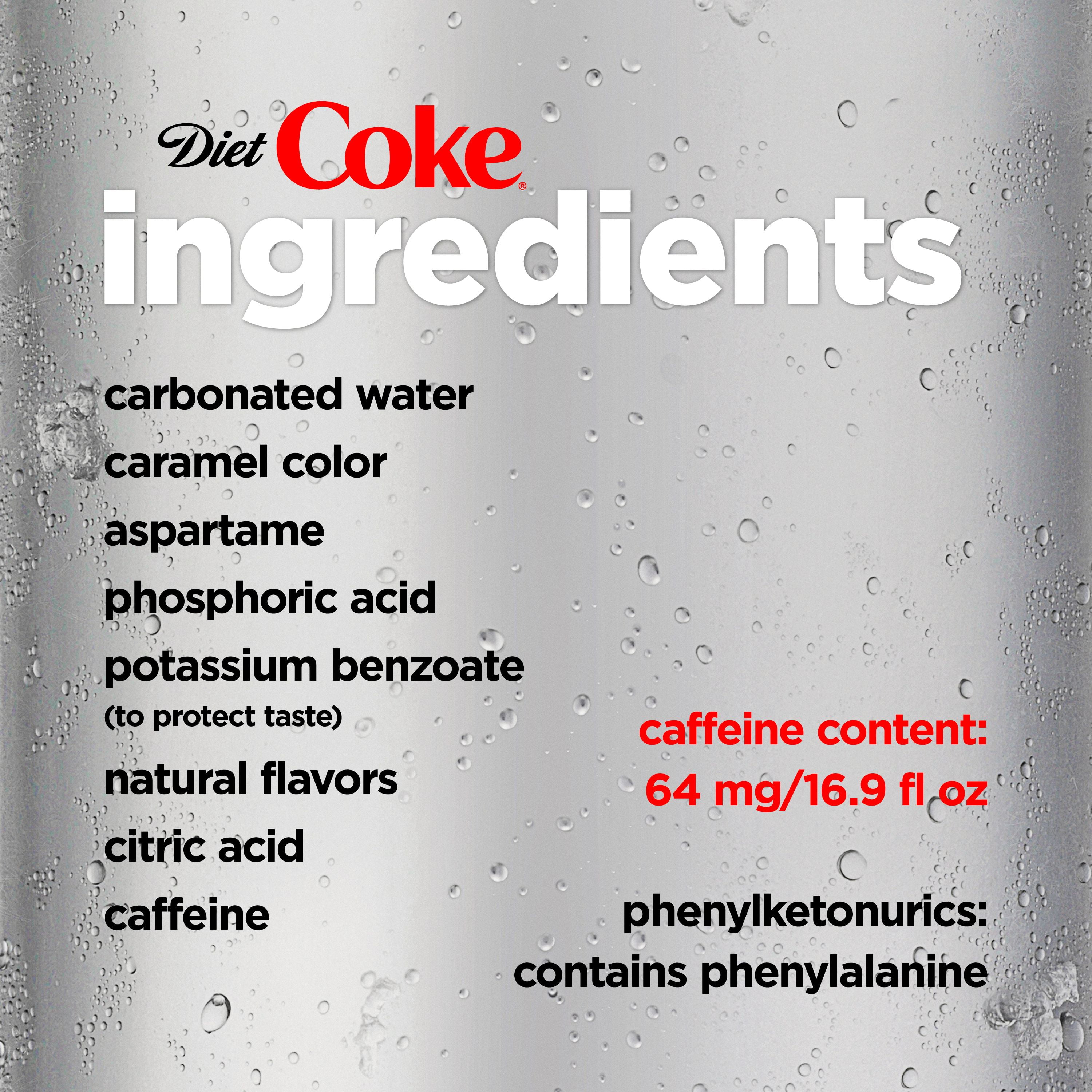 Caffeine Free Diet Coke Caffeine-free Diet Coke is the original great taste of Diet Coke, with no caffeine. A great choice for an afternoon or evening beverage. Cookie Notice. We use cookies to provide a personalized site experience. ... Nutritional Composition % Daily value per serving % Daily value per container. totalFat 0g. 0g 0%. Uninformed. sodium 40mg. 40mg 2% ... Diet Coke Ingredients and Nutrition Facts - Nutrineat The calories in Diet Coke are substantially less as compared to regular Coke. For instance, a 150 ml can contains around 0.5 calories (2.092 kilojoules). Whereas, the same amount of regular Coke contains a whopping 63 calories (263.592 kilojoules). This is the reason why it has become so popular among weight watchers. Variants Diet Coke with Lime