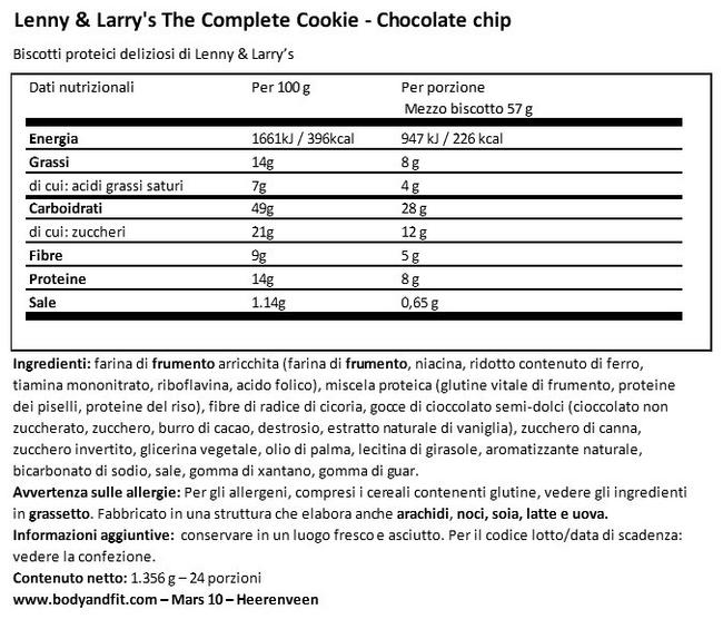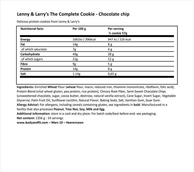 Nutrition Labels | Plans & Pricing | LabelCalc Our database contains over 200,000 USDA-compiled lab-tested ingredients that combine to create your recipes. Because this method is so accurate, the FDA has approved database nutritional analysis for determining your nutrition facts. We only recommend using a lab if your ingredients change in chemical structure during processing (i.e. fermentation during brewing, or deamination in cheese making). Lenny & Larry's | The Complete Cookie - Lenny and Larrys $15.99 16 Reviews Start your day on the right foot with The Complete KickStart™ breakfast bar! Apple Cinnamon has chunks of apple and a sprinkle of cinnamon for a hearty start to the day.With 8g of plant-based protein and 14g of whole grains to provide energy, this vegan bar is filled with goodness to kickstart your day. - + Add to Cart Cookies, chocolate chip, commercially prepared, regular, higher ... - Self Amounts per 1 cookie (average weight of 1 cookie, variety of brands) (12g) Calorie Information Amounts Per Selected Serving %DV Calories 56.9 (238 kJ) 3% From Carbohydrate 29.9 (125 kJ) From Fat...