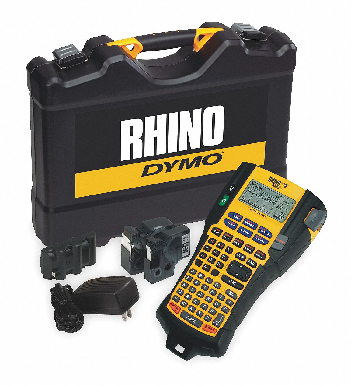 Dymo Rhino 5200 Professional Label Printer Rhino 5200 Professional Labeller Includes 1 tape (19mm White Flexi Nylon) Manuals and warranty info Product specifications: Can be used with either 6 AA batteries (not included), AC power adapter (available separately), or quick-charging lithium ion battery (available separately) 1 year warranty + 1 year extra when registering