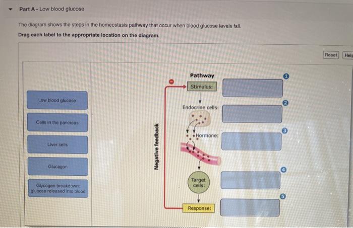 The diagram shows the steps in the homeostasis - Course Hero See Page 1. The diagram shows the steps in the homeostasis pathway that occur when blood glucose levels fall. Drag each label to the appropriate location on the diagram. ANSWER: Correct BioFlix Activity: Homeostasis -- Regulating Blood Sugar Both high blood glucose levels and low blood glucose levels are stimuli that trigger specific responses ...