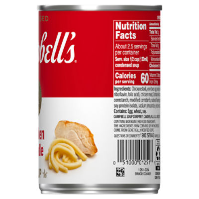 Campbell's® Classic Low Sodium Ready to Serve Chicken Noodle Soup ... chicken stock, enriched egg noodles (wheat flour, eggs, egg whites, niacin, ferrous sulfate, thiamine mononitrate, riboflavin, folic acid), carrots, contains less than 2% of: chicken meat, modified food starch, chicken fat, yeast extract, water, onions*, beta carotene (for color), spice, salt, flavoring, soy protein isolate, sodium phosphate, … PDF CAMPBELL'S® CREAM OF POTATO SOUP NUTRITIONAL FACTS: % Daily Value CAMPBELL'S® CREAM OF POTATO SOUP NUTRITIONAL FACTS: Serving Size 1/2 CUP (120 ML) CONDENSED Amount/Serving Calories 70 Calories From Fat : 10 % Daily Value 1 g 2 %Total Fat 0 g 0 %Saturated Fat 0 gTrans Fat 0.5 gPolyunsaturated Fat 0 gMonounsaturated Fat 5 mg 2 %Cholesterol 900 mg 38 %Sodium 110 mg 3 %Potassium 13 g 4 %Total Carbohydrate 1 g 4 %Dietary Fiber 1 gSugars Cream of Chicken Soup - Campbell Soup Company When you grab the familiar red and white can, know you're grabbing a trustworthy brand that lacks artificial flavors and colors. Where to Buy Nutrition Facts & Ingredients Cream of Chicken Soup Recipes slide 5 to 6 of 3 Slow Cooker Corn and Chicken Chili Country Chicken Casserole Instant Pot® Easy Chicken and Rice Slow Cooker Corn and Chicken Chili Tomato Soup - Campbell Soup Company Tomato Soup. There's a reason that Campbell's® Condensed Tomato Soup reigns supreme. Every can is made with 6 quality, farm-grown tomatoes cooked to perfection and loaded with comforting spoonfuls that burst with exceptional flavor. Cozy up with the ultimate comfort food- Campbell's Tomato Soup with grilled cheese or Goldfish® crackers!