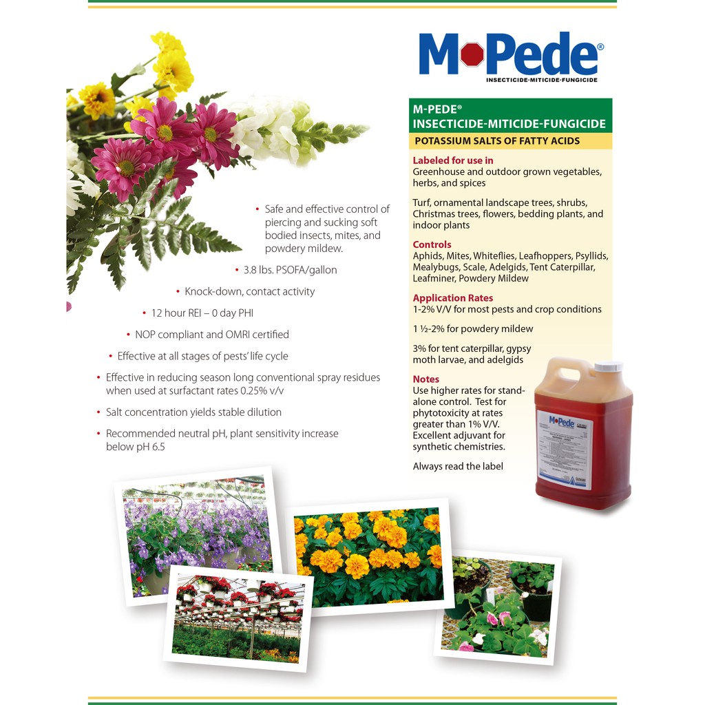 M-pede label. M-Pede_EPA10163-324_label_2013-10-01.pdf - Plant Products This product may be used as a foliar spray to control or suppress soft bodied pests which include: adelgid, aphid, earwig, lace bug, leafhopper, mealybug, mole ... Insecticidal soap - Wikipedia Insecticidal soap is used to control many plant insect pests. Soap has been used for more than 200 years as an insect control. Because insecticidal soap works on direct contact with pests via the disruption of cell membranes when the insect is penetrated with fatty acids, the insect's cells leak their contents causing the insect to dehydrate and die. ... M-Pede - Gowan Company M-Pede® is a natural, soft, insecticide, miticide, and fungicide that provides excellent contact control of various soft bodied insects, mites, ... Insecticides - M-Pede® - Arbico Organics This foliar-spray insecticide/miticide/fungicide uses potassium salts of naturally derived fatty acids (also known as insecticidal soap) to provide contact ...
