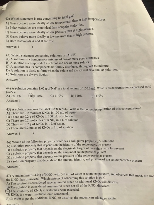 A solution contains the label 0.2 m kno3. what is the correct interpretation of this concentration?. Argument-driven Inquiry In Chemistry : Lab Investigations For Grades 9 ... E-Book Overview Transform your chemistry labs with this guide to argument-driven inquiry. Designed to be much more authentic for instruction than traditional laboratory activities, the investigations in this book give high school students the opportunity to work the way scientists do. Chapter 6: Reactions and Solutions - Studylib A solution contains the label 0.2 M KNO3. What is the correct interpretation of this concentration? A) There are 0.2 moles of KNO3 in 100 mL of water. B) There are 0.2 g of KNO3 in 100 mL of solution. C) There are 0.2 molecules of KNO3 in 1 L of solution. D) There are 0.2 g of KNO3 in 1 L of water. E) There are 0.2 moles of KNO3 in 1 L of ... Chemistry Exam 2 Flashcards | Quizlet Study with Quizlet and memorize flashcards containing terms like Which statement concerning solutions is FALSE?, Which statement concerning solution concentration is FALSE?, A solution contains the label 0.2 M KNO3. What is the correct interpretation of this concentration? and more. dokumen.pub › general-chemistry-principles-andGeneral Chemistry: Principles and Modern Applications (10th ... It is a good idea to memorize the most common SI prefixes (such as G, M, k, d, c, m, m, n, and p) because you can t survive in a world of science without knowing the SI prefixes. official spelling of this unit is metre, but we will use the American spelling. mole is introduced in Section 2-7. cElectric current is described in Appendix B and in ...