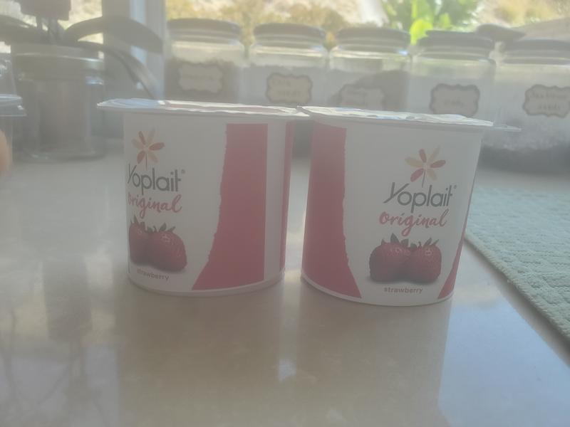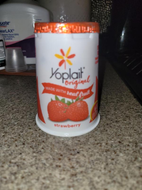 Strawberry | Original Yogurt With Real Fruit| Yoplait Ingredients Cultured Grade A Low Fat Milk, Sugar, Strawberries, Modified Food Starch, Water. Contains 1% or less of: Corn Starch, Tricalcium Phosphate, Carmine (for color), Pectin, Natural Flavor, Kosher Gelatin, Vitamin A Acetate, Vitamin D3. CONTAINS MILK INGREDIENTS Nutrition Facts Serving Size 1 container