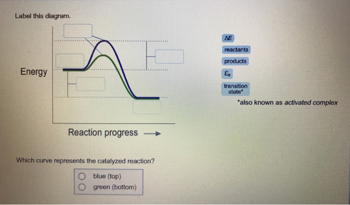 Solved Label this diagram. Energy Reaction progress Which Energy Reaction progress Which curve represents the catalyzed reaction? O blue (top) O green (bottom) transition state reactants products *Note that a ... Join LiveJournal Password requirements: 6 to 30 characters long; ASCII characters only (characters found on a standard US keyboard); must contain at least 4 different symbols; Solved Label this diagram. AH reactants products Energy E Which curve represents the catalyzed reaction? O blue (top) O green (bottom). This problem has been solved! You'll get a detailed solution ...