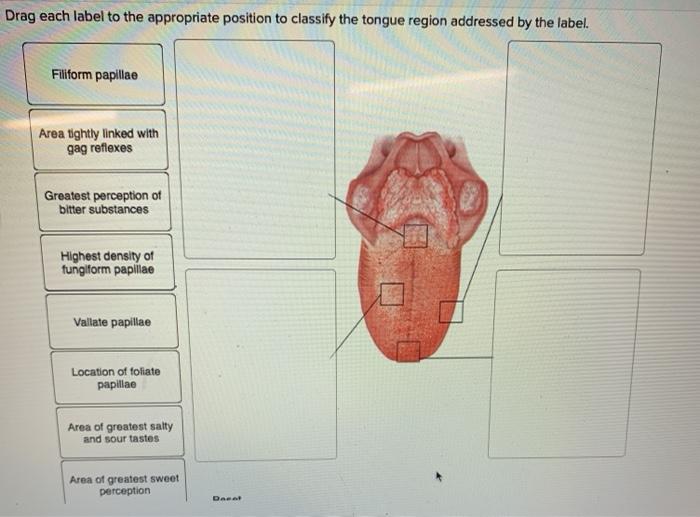 Solved Help Drag each label to the appropriate position to - Chegg Help Drag each label to the appropriate position to classify the tongue region addressed by the labe Filiform papillae Location of foliate papillae ed Area tightly linked with gag reflexes of Area of greatest sweet perception Area of greatest salty and sour tastes Highest density of fungiform papillae Reset
