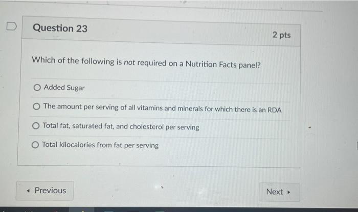 Which of the following is not required on a food label? (points : 2 ... 03/08/2017 Health High School answered Which of the following is not required on a food label? (points : 2 total calories vitamin d percentage total fat calories protein percentage vitamin d content is not required information on a nutrition label? 1 See answer Add answer + 5 pts Advertisement sisi5naAraLiesmilyg is waiting for your help. NUT Quiz 2 - Which of the following is not required on a nutrition ... Which of the following is not required on a nutrition label? Select one: a. The amount of all vitamins and minerals for which there is an RDA b. The serving size c. Total kcalories from fat per serving d. Total fat, saturated fat, cholesterol, sodium, protein, and total carbohydrate in sugars and dietary fiber Feedback The correct answer is: The amount of all vitamins and minerals for which ...