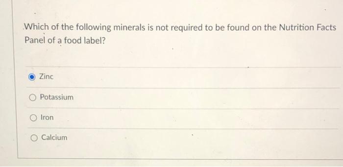 Nutrition Chapter 2 Quiz Flashcards | Quizlet Which of the following is NOT required on a food label? a.sodium (mg/serving) b. folic acid (µg/serving) c. dietary fiber (g/serving) d. cholesterol (mg/serving) B A serving size defined by the USDA Food Patterns a. is always the same as a serving size on a food label. b.may be different than the serving size on a food label. Which of the following is not required by law to be listed on a food label? The U.S. Food and Drug Administration (FDA) currently requires sodium to be listed on nutrition facts, but potassium labeling is optional. "The declaration of potassium is only mandatory when a nutrient/content or health claim about potassium is being made," a representative from the FDA told Reuters Health via email. Learn How the Nutrition Facts Label Can Help You Improve Your Health The Nutrition Facts label on packaged foods is based on updated science and dietary recommendations for Americans. Using the label can help you choose foods for a healthy diet. The label is required on all packaged foods made in the United States and imported from other countries. The US Food and Drug Administration (FDA) issued regulations in ...