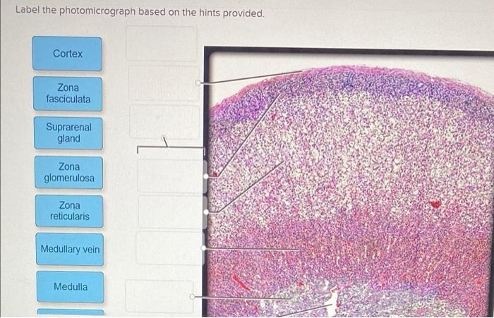 Label The Photomicrograph Based On The Hints Provided Lipid Inclusion ... Label the structures in the photomicrograph based on the hints provided. Zona fasciculata, the middle zone of the adrenal cortex secretes glucocorticoids which are important for carbohydrate, protein and lipid . In a first stage, snow algae could be favored in ablation zones as melting provides suitable environments for their development, .
